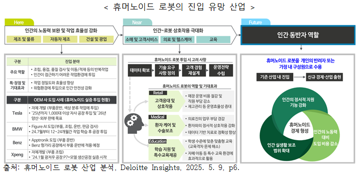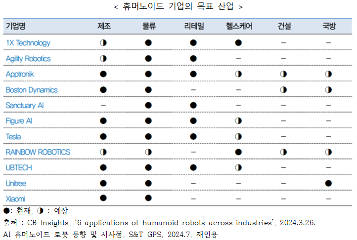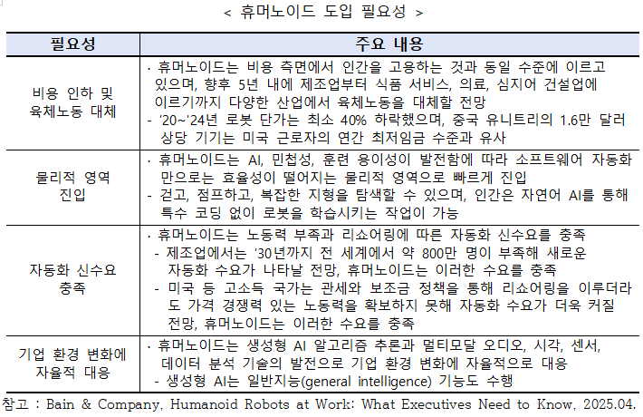 ÀÚµ¿Â÷ °øÁ¤ÀÇ °æ¿ì Àú¼÷·Ã ¹Ýº¹ ÀÛ¾÷ À§ÁÖ·Î ¿Ï¼ºÂ÷ ±â¾÷µéÀÇ ÈÞ¸Ó³ëÀ̵å Å×½ºÆ®°¡ ÁøÇà ÁßÀÌ´Ù. º¥Ã÷¿Í BMW°¡ ÈÞ¸Ó³ëÀÌµå ·Îº¿ µµÀÔ Å×½ºÆ®¸¦ ÁøÇàÇϰí ÀÖÀ¸¸ç, º¥Ã÷´Â ApptronikÀÇ Apollo ·Îº¿À» ºÎǰ °Ë»ç, Á¶¸³, »ý»ê¶óÀÎ ÀÛ¾÷ÀÚ¿¡°Ô ºÎǰ Àü´Þ µî¿¡ ÅõÀÔ ¿¹Á¤ÀÌ´Ù.1) ¡á ÈÞ¸Ó³ëÀÌµå ·Îº¿ÀÇ ¸ñÇ¥ »ê¾÷ ÈÞ¸Ó³ëÀÌµå ·Îº¿Àº Àΰ£°ú À¯»çÇÑ ¿ÜÇü°ú ÇൿÀ» °®Ãß¾î Àΰ£ÀÌ »ýȰÇϰí ÀÛ¾÷Çϴ ȯ°æ¿¡¼ È¿°úÀûÀ¸·Î Ȱµ¿ÇÒ ¼ö ÀÖµµ·Ï ¼³°èµÈ ·Îº¿À¸·Î, AI ±â¼ú°ú °áÇÕµÇ¸é¼ º¹ÀâÇÑ ÀÛ¾÷À» ¼öÇàÇϰí ÇнÀ ¹× ÀûÀÀ ´É·ÂÀ» °ÈÇÏ¿© ´õ ¹ßÀüµÈ ÇüÅ·ΠÁøÈ ÁßÀÌ´Ù. ÈÞ¸Ó³ëÀÌµå ·Îº¿Àº Àΰ£ÀÇ ³ëµ¿·ÂÀ» º¸¿ÏÇϸç È¿À²¼ºÀ» ³ôÀ̴µ¥ °¢ »ê¾÷¿¡¼ Áß¿äÇÑ ¿ªÇÒÀ» Çϰí ÀÖÀ¸¸ç, Àΰ£¡¤·Îº¿ °£ÀÇ »óÈ£ÀÛ¿ë°ú Çù¾÷ÀÌ ±Ø´ëÈµÇ¸é¼ Á¦Á¶ ¹× ¹°·ùºÐ¾ß »Ó¸¸ ¾Æ´Ï¶ó °í°´ ÀÀ´ë, Á¤¼Àû Áö¿ø, ½Ç»ýȰ º¸Á¶ µîÀÇ ºÐ¾ß¿¡¼ µ¿¹ÝÀÚ ¿ªÇÒÀ» ÇÒ °ÍÀ¸·Î ±â´ëµÇ°í ÀÖ´Ù.