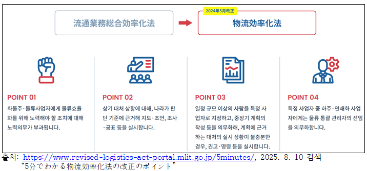 ³ëµ¿¹æ½Ä °³Çõ °ü·Ã¹ý¿¡¼´Â ½Ã°£è⠳뵿ÀÇ »óÇÑÀº ¿øÄ¢ÀûÀ¸·Î ¿ù 45½Ã°£, ¿¬ 360½Ã°£À¸·Î Á¦ÇѵǸç, ³ë»ç°£¿¡ ¡®36ÇùÁ¤¡¯1)À» ¸Î¾îµµ ½Ã°£¿Ü ³ëµ¿Àº ¿¬ 720½Ã°£À¸·Î Á¦ÇѵȴÙ. ÀÏÇÏ´Â ¹æ½Ä °³Çõ °ü·Ã¹ýÀº ´ë±â¾÷¿¡¼´Â 2019³â 4¿ùºÎÅÍ Áß¼Ò±â¾÷¿¡¼´Â 2020³â 4¿ùºÎÅÍ ½ÃÇàµÇ°í ÀÖ´Ù. *¡¸¹°·ùÀÇ 2024³â ¹®Á¦¡¹¿¡ ´ëÇÑ ¼¼ºÎÀûÀÎ ³»¿ë°ú ¿µÇâ, ÀϺ» Á¤ºÎ ¹× ±â¾÷ Â÷¿øÀÇ ´Ù¾çÇÑ ´ëÀÀ ¹æ¾È µî¿¡ ´ëÇØ¼´Â ±â ¿¬ÀçµÈ 2023³â 10~11¿ùÈ£ ¹× 2024³â 4~5¿ùÈ£ ÂüÁ¶ ¡á ¹°·ù 2026³â ¹®Á¦¶õ? ¡¸¹°·ù 2026³â ¹®Á¦¡¹¶õ 2026³â 4¿ù¿¡ ½ÃÇàµÇ´Â °³Á¤ ¡¸¹°·ù üùëÒûùÛö¡¹¿¡ ÀÇÇØ ÀÏÁ¤ ±Ô¸ð ÀÌ»óÀÇ ÈÁÖ ±â¾÷¿¡ ¹°·ù È¿À²ÈÀÇ Àǹ«°¡ ºÎ°úµÇ´Â ¹®Á¦ÀÌ´Ù. ÀÌ ¹ý °³Á¤Àº ½É°¢¼ºÀ» ´õÇØ°¡´Â µå¶óÀ̹ö ºÎÁ·À̳ª °ø±ÞüÀÎ ÀüüÀÇ Áö¼Ó °¡´É¼ºÀ» È®º¸Çϱâ À§ÇØ µµÀԵǴ Á¦µµÀÌ´Ù. 2026³â 4¿ù°æ ½ÃÇàÀÌ ¿¹Á¤µÇ¾î ÀÖ´Â ¡¸ÚªíÀªÎ×µ÷תÎ効áãûùªË関ª¹ªëÛö×È¡¹£¨ì¤ù»¡¢ãæÚª効Ûö)ÀÌ ÀϺ»ÀÇ Á¦Á¶ ¹× ¹°·ù¾÷°è¸¦ Èçµé°í ÀÖ´Ù. ÀÌ ¹ý ½ÃÇà 1³â Èĸ¦ ¸ñÇ¥·Î ¡®Æ¯Á¤ »ç¾÷ÀÚ¡¯ ¾à 3,200°³»ç¿¡ ´ëÇØ ¹°·ù È¿À²È¿¡ ´ëÇÑ ´ëó³ª ±× °á°úÀÇ Á¤±â º¸°í°¡ Àǹ«ÈµÇ±â ¶§¹®ÀÌ´Ù. ±¹°¡°¡ ³ªÅ¸³»´Â ÆÇ´Ü±âÁØÀ» À§¹ÝÇÏ¿© ¡®±Ç°í¡¯¸¦ ¹ÞÀº °æ¿ì À§¹ÝÇÑ »ç¾÷ÀÚ´Â ½Ç¸íÀ» °øÇ¥ÇÑ´Ù.