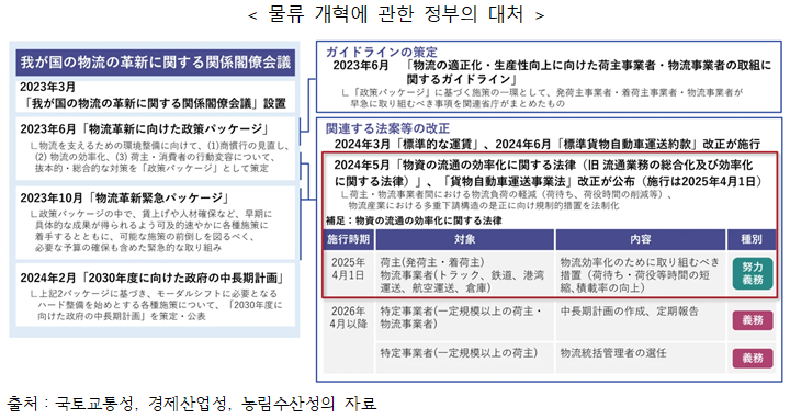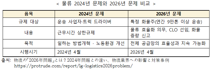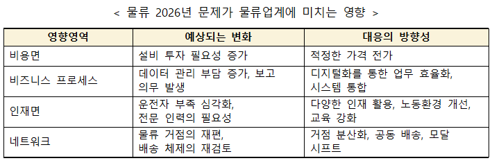 ¡á ¹°·ù 2026³â ¹®Á¦ ¹è°æ°ú ÁÖ¿ä Æ÷ÀÎÆ® ÀϺ» ¹°·ù¾÷°è¿¡¼´Â 2024³â ¹®Á¦¿¡ À̾î, 2026³â¿¡µµ Å« °úÁ¦°¡ ¾ÕµÎ°í ÀÖ´Ù. ³ëµ¿È¯°æÀÇ °³¼±À̳ª ±ÔÁ¦ °È°¡ ÁøÇàµÇ´Â ÇÑÆí, ±â¾÷(ÈÁÖ)ÃøÀÇ ´ëÀÀÀÌ ¿ä±¸µÇ¾î ¿î¼Û ºñ¿ëÀÇ Áõ°¡³ª µå¶óÀ̹ö ºÎÁ·ÀÇ ½É°¢È°¡ ¿ì·ÁµÇ°í ÀÖ´Â »óȲÀÌ´Ù. 1) ³ëµ¿È¯°æ °³¼± ¹× ¹°·ù È¿À²È 2024³â ½Ã°£¿Ü ³ëµ¿±ÔÁ¦ ¿Ü¿¡µµ 2026³â¿¡´Â ¹°·ù¾÷°è Àüü¿¡¼ ¾÷¹« È¿À²È°¡ ¿ä±¸µÇ°í ÀÖ´Ù. 2) ÈÁÖ Ã¥ÀÓ °È ¹× ÄÄÇöóÀ̾𽺠´ëÀÀ 2026³âºÎÅʹ ƯÁ¤ ȹ°ÁÖ¿¡ ´ëÇÏ¿© ȹ°Áß·®ÀÇ ½Å°í°¡ Àǹ«ÈµÇ¾î ¹°·ù Åë°ý°ü¸®ÀÚÀÇ ¼±ÀÓ°ú ¹°·ùÈ¿À²ÈÀÇ ´ëó°¡ ¿ä±¸µÈ´Ù. 3) ¿îÀüÀÚ ºÎÁ· ½É°¢È Áö¼Ó ¿ì·Á ½Ã°£¿Ü ³ëµ¿ÀÇ ±ÔÁ¦ °È¿Í °í·ÉȰ¡ ±Þ¼ÓÇÑ ÁøÇà¿¡ ÀÇÇØ ¿îÀüÀÚ ºÎÁ·ÀÌ ´õ¿í ½É°¢ÇØÁú °ÍÀ¸·Î ¿¹»óµÇ¾î, ¿î¼Û ºñ¿ëÀÇ »ó½ÂÀ̳ª ¹è¼ÛÀÇ Áö¿¬ÀÌ ¿¹»óµÈ´Ù. ÀÌ·Î ÀÎÇØ ±â¾÷µéÀº °øµ¿¹è¼ÛÀÇ µµÀÔÀ̳ª ¸ð´Þ ½ÃÇÁÆ®ÀÇ ÃßÁø, µå¶óÀ̹öÀÇ ³ëµ¿È¯°æ °³¼±¿¡ ÀÓÇÏ´Â °ÍÀÌ ¿ä±¸µÇ°í ÀÖ´Ù. 2026³â ¹®Á¦¿¡ ´ëÀÀÇϱâ À§Çؼ´Â ±â¾÷¡¤ÈÁÖ¡¤¹°·ù»ç¾÷ÀÚ°¡ ÀÏü°¡ µÇ¾î ¹°·ùÀÇ È¿À²È¿Í ³ëµ¿È¯°æÀÇ °³¼±¿¡ ÀÓÇÏ´Â °ÍÀÌ ÇʼöÀûÀÎ »çÇ×À¸·Î Àνĵǰí ÀÖ´Ù. 2026³â ¹®Á¦ÀÇ ¿µÇâ°ú ¿¹»óµÇ´Â º¯È ¡á 2026³â ¹®Á¦°¡ ¹°·ù¾÷°è¿¡ ¹ÌÄ¡´Â ¿µÇâ 2026³â ¹®Á¦´Â ƯÁ¤ ȹ°ÁÖ»Ó¸¸ ¾Æ´Ï¶ó ¹°·ù¾÷°è Àüü¿¡ Å« ¿µÇâÀ» ¹ÌÄ¥ °ÍÀ¸·Î ¿¹»óµÇ°í ÀÕ´Ù. ¹°·ù¾÷°è´Â Á¾·¡ºÎÅÍ Àη ºÎÁ·À̳ª È¿À²ÈÀÇ Áö¿¬ µî ¸¹Àº °úÁ¦¸¦ ¾È°í ÀÖ¾úÀ¸¸ç, 2026³â ¹®Á¦¸¦ °è±â·Î ÀÌ·¯ÇÑ °úÁ¦¿¡ ´ëÇÑ ±Ùº»ÀûÀÎ ÇØ°áÀÌ ¿ä±¸µÇ°í ÀÖ´Ù.