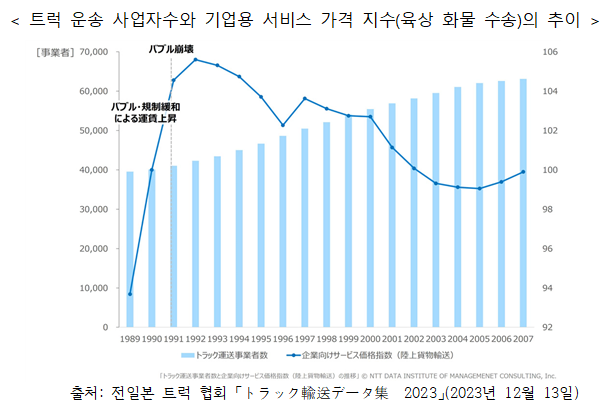 ¡á ¹°·ù 2¹ýÀÌ °¡Á®¿Â ¿µÇâ°ú ±ÔÁ¦ ¹°·ù 2¹ý ½ÃÇàÀº ÀϺ» ¹°·ù½ÃÀå¿¡ Å« º¯È¸¦ °¡Á®¿Ô´Ù. 1990³âÀÇ ¹ý °³Á¤¿¡ ÀÇÇØ ½ÃÀå ½Å±Ô Âü°¡°¡ ¿ëÀÌÇØÁ®, ±×¿¡ µû¶ó »ç¾÷ÀÚ¼ö´Â ²ÙÁØÈ÷ Áõ°¡Çß´Ù. 1990³â¿¡ ¾à 4¸¸¸íÀÌ¿´´ø Æ®·°¿î¼Û»ç¾÷ÀÚ ¼ö´Â 2007³â¿¡´Â 6.3¸¸¸íÀ» ³Ñ¾î ¾à 1.6¹è¿¡ ´ÞÇß´Ù(¾Æ·¡ ±×¸²). ÀÌ·Î ÀÎÇØ ½ÃÀå Ȱ¼ºÈ°¡ ÁøÇàµÇ¾î Åù質 ¸ÞÀÏÆí, ÄðÆí µî ´Ù¾çÇÑ ¹°·ù ¼ºñ½º°¡ ź»ýÇØ ÀÌ¿ëÀÚÀÇ ¼±ÅûçÇ×ÀÌ ´ëÆø È®´ëµÇ¾ú´Ù. ±×·¯³ª ½Å±Ô Âü°¡ÀÚ Áõ°¡¿Í ½ÃÀå Ȱ¼ºÈ°¡ ÁøÇàµÇ´Â ÇÑÆí, °¡°Ý °æÀï °Ýȶó´Â »õ·Î¿î °úÁ¦µµ ºÎ»óÇß´Ù. 1990³âÀ» 100À¸·Î ÇÑ ±â¾÷¿ë ¼ºñ½º °¡°Ý Áö¼ö¿¡ ±Ù°ÅÇÑ ¼ö¼Û ºñ¿ëÀÇ ÃßÀ̸¦ º¸¸é, 1990³âºÎÅÍ 1992³â¿¡ °ÉÃÄ ÀϽÃÀûÀ¸·Î »ó½ÂÇßÁö¸¸ 1993³â ÀÌÈÄ´Â ÀúÇÏ °æÇâÀ¸·Î ¹Ù²î°í, 2000³â¿¡´Â 100À» ¹Øµµ´Â ¼öÁØÀ¸·Î ¶³¾îÁ³´Ù. ÀÌ·¯ÇÑ °¡°Ý µ¿ÇâÀº °ú´ç °æÀïÀ¸·Î ÀÎÇØ »ç¾÷ÀÚ°¡ ÃæºÐÇÑ ¼öÀÍÀ» È®º¸Çϱ⠾î·Á¿î »óȲ¿¡ ³õ¿© ÀÖ¾ú´Ù´Â °ÍÀ» º¸¿©ÁØ´Ù.