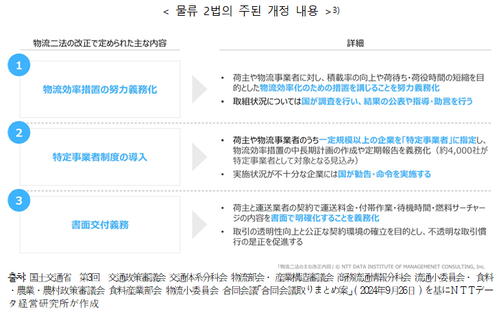 ¨é ¼¸é ±³ºÎ Àǹ« ȹ°ÁÖ¿Í ¿î¼Û¾÷ÀÚÀÇ °è¾à¿¡ ÀÖ¾î¼, ¿ª¹«ÀÇ ³»¿ë°ú ´ë°¡¸¦ ¸íÈ®È÷ Çϰí, ¼¸éÀ¸·Î ±³ºÎÇÏ´Â °ÍÀÌ Àǹ«ÈµÇ¾ú´Ù. ÀÌ¿¡ µû¶ó ºÒÅõ¸íÇÑ °Å·¡ °üÇàÀ» ½ÃÁ¤ÇÏ°í °øÁ¤ÇÑ °Å·¡ ȯ°æÀÇ È®¸³À» ¸ñÇ¥·Î Çϰí ÀÖ´Ù. ¼¸é¿¡´Â ¿î¼Û¿ä±Ý»Ó¸¸ ¾Æ´Ï¶ó ºÎ´ëÀÛ¾÷ÀÇ ³»¿ëÀ̳ª ´ë±â½Ã°£ÀÇ Ãë±Þ, ¿¬·á¼Â÷ÁöÀÇ »êÁ¤¹æ¹ý µîµµ ¸í±âÇÏ´Â °ÍÀÌ ¿ä±¸µÇ¾î °Å·¡ÀÇ Åõ¸í¼ºÀÌ ´ëÆø Çâ»óµÉ °ÍÀ¸·Î ±â´ëµÈ´Ù. ¡á ¹°·ù 2¹ý °³Á¤¿¡ µû¸¥ ±â´ë È¿°ú ÀÌ·¯ÇÑ ¹ý °³Á¤À¸·Î Á¤ºÎ´Â ³ëµ¿È¯°æ °³¼±, ¼ö¼ÛÈ¿À² Çâ»ó, ÀûÁ¤ÇÑ ¿îÀÓ¼ö¼ö ½ÇÇö, °Å·¡ Åõ¸íÈ µî ´Ù¹æ¸é¿¡ °ÉÄ£ È¿°ú¸¦ ³ë¸®°í ÀÖÀ¸¸ç, ¹°·ù¾÷°è¿¡¼´Â Áö¼Ó°¡´ÉÇÑ »ê¾÷±¸Á¶·ÎÀÇ ÀÌÇàÀÌ ±â´ëµÈ´Ù. ¨ç ¿îÀüÀÚÀÇ ³ëµ¿ ȯ°æ °³¼± ÀûÁ¤ÇÑ ¿îÀÓ ¼³Á¤À̳ª ³ëµ¿½Ã°£ÀÇ ±ÔÁ¦ °È°¡ ÁøÇàµÊ¿¡ µû¶ó ¿îÀüÀÚÀÇ ´ë¿ì°¡ °³¼±µÇ¾î ÀÎÀç È®º¸°¡ ¿ëÀÌÇØÁø´Ù. ÀÌ¿¡ µû¶ó ¹°·ù¾÷°èÀÇ ¸¸¼ºÀû ÀÎ¼Õ ºÎÁ· ÇØ¼Ò°¡ ±â´ëµÈ´Ù. ÀϺ»ÀÇ ¹°·ùÇõ½Å¿¡ °üÇÑ °ü°è °¢·áȸÀÇ¿¡¼´Â ÀûÁ¤ÇÑ ¿îÀÓ¼ö¼ö°¡ ½ÇÇöµÇ¸é Æ®·¢µå¶óÀ̹öÀÇ ¿¬°£ ¼ÒµæÀº 10% ÀüÈÄ Çâ»óµÉ °ÍÀ¸·Î ¿¹ÃøµÈ´Ù. ¨è ¿î¼Û ´É·Â Çâ»ó °øµ¿ ¼ö¼ÛÀÇ ÃËÁø ¹× ¼ö¼Û ¼ö´ÜÀÇ ´Ù¾çÈ¿¡ ÀÇÇØ, ¼ö¼ÛÀÇ È¿À²ÀÌ Çâ»óµÇ¾î, ¾ÈÁ¤µÈ ¹°·ù °ø±ÞÀÌ °¡´ÉÇØÁø´Ù. ÀÌ¿¡ µû¶ó ¹°·ù¾÷°è ÀüüÀÇ »ý»ê¼ºÀÌ Çâ»óµÇ¾î ±â¾÷ÀÇ °æÀï·Â °È·Î À̾îÁø´Ù. ÀÌ È¸ÀÇ¿¡¼´Â ¹°·ù È¿À²È Á¶Ä¡ÀÇ º¸±ÞÀ¸·Î 2030³â±îÁö ÀûÀçÀ² 44%¸¦ ¸ñÇ¥·Î Çϰí ÀÖ´Ù. ¨é ½ÃÀå ¾ÈÁ¤È °úµµÇÑ °¡°Ý °æÀïÀÌ ¾ïÁ¦µÊ¿¡ µû¶ó ÀûÁ¤ÇÑ ¿îÀÓ ÇÏ¿¡¼ ¾ÈÁ¤µÈ ½ÃÀåȯ°æÀÌ °®ÃçÁø´Ù. ÀÌ¿¡ µû¶ó »ç¾÷ÀÚÀÇ °æ¿µ ±â¹ÝÀÌ °ÈµÇ°í Àå±âÀûÀÎ ºñÁî´Ï½º Áö¼Ó °¡´É¼ºÀÌ Çâ»óµË´Ï´Ù. ¨ê °Å·¡ Åõ¸íÈ °è¾à ³»¿ëÀÌ ¸íÈ®ÇØÁü¿¡ µû¶ó ȹ°ÁÖ¿Í ¿î¼Û¾÷ü°£ÀÇ Æ®·¯ºíÀÌ °¨¼ÒÇÑ´Ù. °Å·¡È¯°æ °³¼±Àº ¹°·ù¾÷°èÀÇ ½Å·Ú¼º Çâ»ó¿¡µµ ±â¿©Çϰí Áö¼ÓÀûÀÎ ¼ºÀåÀ» Áö¿øÇÏ´Â ±â¹ÝÀÌ µÈ´Ù. ±×·¯³ª ÛöÁ¤ºñ¸¸À¸·Î´Â º¹ÀâÇÏ°Ô ¾ôÈ÷´Â ¾÷°è °úÁ¦³ª ¾÷°è °ü½ÀÀ» Àç°ËÅäÇϱ⿡´Â ÇѰ谡 ÀÖ´Ù. ¹°·ù¾÷°è Àüü¸¦ ¹Ù²Ù¾î°¡±â À§Çؼ´Â ¹Î°£±â¾÷ÀÇ Çù·ÂÀÌ ÇʼöÀûÀ̸ç, ÇâÈÄ ±â¾÷ÀÌ ¾î¶»°Ô ´ëÀÀÇØ ³ª°¥Áö°¡ ¾÷°èÀÇ Àå·¡¸¦ Á¿ìÇÏ´Â Áß¿äÇÑ Æ÷ÀÎÆ®°¡ µÈ´Ù. ƯÈ÷ µðÁöÅÐ ±â¼úÀÇ È°¿ëÀ̳ª ¾÷°è Ⱦ´ÜÀûÀÎ ¿¬°è ÃËÁø µî °³Á¤¹ýÀÇ ÃëÁö¸¦ ±Ù°Å·Î ÇÑ Àû±ØÀûÀÎ ´ëó°¡ ¿ä±¸µÈ´Ù. (Â÷¿ùÈ£ °è¼Ó) ¡Ø Â÷¿ùÈ£¿¡´Â ¡¸À¯Åë ¾÷¹«ÀÇ Á¾ÇÕÈ ¹× È¿À²ÈÀÇ ÃËÁø¿¡ °üÇÑ ¹ý·ü ¹× ȹ°ÀÚµ¿Â÷ ¿î¼Û »ç¾÷¹ý¡¹ÀÇ ÁÖ¿ä °³Á¤ ³»¿ë¿¡ ´ëÇØ ¾Ë¾Æº¸°íÀÚ ÇÑ´Ù. ÁÖ1. 36ÇùÁ¤À̶õ ¡®½Ã°£¿Ü¡¤ÈÞÀϳ뵿¿¡ °üÇÑ ÇùÁ¤½Å°í¡¯¸¦ ¸»ÇÑ´Ù. ¡¸³ëµ¿±âÁعý¡¹ Á¦36Á¶¿¡ µû¶ó ȸ»ç´Â ¹ýÁ¤³ëµ¿½Ã°£(1ÀÏ 8½Ã°£, ÁÖ 40½Ã°£)À» ÃʰúÇÏ´Â ½Ã°£¿Ü³ëµ¿ ¹× ÈÞÀÏ ±Ù¹« µîÀ» ¸í·ÉÇÏ´Â °æ¿ì, ³ëÁ¶ µî°ú ¼¸é¿¡ ÀÇÇÑ ÇùÁ¤À» ¸Î¾î ³ëµ¿±âÁذ¨µ¶¼¿¡ Àǹ«ÀûÀ¸·Î ½Å°íÇÏ¿©¾ß Çϱ⠶§¹®¿¡ ÀϹÝÀûÀ¸·Î ¡®36ÇùÁ¤¡¯À̶ó°í ºÎ¸£°í ÀÖ´Ù. ÁÖ2. https://www.nttdata-strategy.com/knowledge/reports/2025/250509/, ڪ׵ì£ÛöªÎËÇïáªÈÐêåöª¬ªÈªëªÙª対応, ڪ׵ì£ÛöËÇï᪬ªâª¿ªéª¹ã檿ªÊÓû戦ªÈѦ会, ÀϺΠÀÇ¿ª Æ÷ÇÔ ÁÖ3. https://www.nttdata-strategy.com/knowledge/reports/2025/250509/ -Âü°í¹®Çå ¹× ÀÚ·á- 1. ¡°5ݪǪ磌ªëڪ׵効áãûùÛöªÎËÇïáªÎ«Ý«¤«ó«È¡±, https://www.revised-logistics-act-portal.mlit.go.jp/5minutes/, 2025. 8. 10 °Ë»ö 2. ڪ׵ªÎ¡¸2026Ò´Ùý𹡹ªÈªÏ£¿2024Ò´Ùýð¹ªÈªÎêÞª¤¡¢Úª×µåöÍ£ªØªÎç¯úªÈ対óþÞÀÖÇ, https://protrude.com/report/lg-logistics2026problem/ 3. ڪ׵ì£ÛöªÎËÇïáªÈÐêåöª¬ªÈªëªÙª対応, ڪ׵ì£ÛöËÇï᪬ªâª¿ªéª¹ã檿ªÊÓû戦ªÈѦ会, https://www.nttdata-strategy.com/knowledge/reports/2025/250509/ 4. ÀüÀϺ» Æ®·° Çùȸ ¡¸«È«é«Ã«¯âÃáê«Çー«¿ó¢¡¡2023¡¹(2023³â 12¿ù 13ÀÏ) 5. 国÷ÏÎß÷×àý¡¡ð¯3üÞ¡¡Îß÷×ïÙóþãûì¡会 Îß÷×体ͧÝÂΡ会 ڪ׵ݻ会・ ß§åöϰðããûì¡会 ßÂÙâ×µ÷×ï×ÜÃÝÂΡ 会 ×µ÷×á³êÍê¬会・ãÝÖù・ÒÜåö・ÒÜõ½ïÙóþãûì¡会 ãÝÖùß§åöÝ»会 ڪ׵á³êÍê¬会 ùêÔÒ会ì¡¡¸ùêÔÒ会ì¡ö¢ ªêªÞªÈªáäС¹£¨2024Ò´9êÅ26ìí£©ªòÐñªË£Î£Ô£Ô«Çー«¿経営研ϼᶪ¬íÂà÷ 6. https://www.nttdata-strategy.com/knowledge/reports/2025/250509/ 7. https://svl.co.jp/services/environmental-impact-solutions/ ![]() ¹ÚÂù¼®Àº ¹Ì·¡¹°·ùÄÁ¼³ÆÃÀÇ ´ëÇ¥·Î ÀçÁ÷ ÁßÀ̸ç, ¹°·ù/SCM ºÐ¾ß ÄÁ¼³ÆÃ°ú Çѱ¹»ý»ê¼ºº»ºÎ, Çѱ¹ÅëÇÕ¹°·ùÇùȸ ¹× ±â¾÷ü ´ë»óÀÇ ¹°·ù/SCMÀü¹® °»ç·Î Ãâ° Áß¿¡ ÀÖÀ¸¸ç, ¾÷ü ÄÁ¼³ÆÃ(¹°·