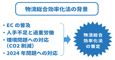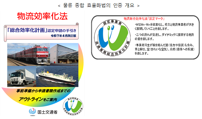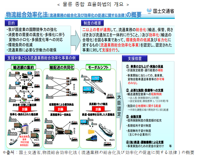 ¹°·ù Á¾ÇÕ È¿À²È¹ýÀº 2005³â¿¡ ½ÃÇàµÇ¾î 2008³â°ú 2020³â, 2024³â¿¡ °³Á¤µÇ¾ú´Ù. ¹°·ù Á¾ÇÕ È¿À²È¹ýÀº À¯Åë ¾÷¹«ÀÇ Á¾ÇÕÈ¿Í È¿À²È¸¦ µµ¸ðÇÏ´Â ¹ý·üÀÌ´Ù. ȯ°æ ºÎÇÏÀÇ Àú°¨À̳ª Àý·ÂÈ¿¡ ±â¿©ÇÏ´Â »ç¾÷¿¡ ´ëÇØ¼ Á¤ºÎ°¡ Áö¿øÀ» ½Ç½ÃÇÏ´Â °ÍÀ» Á¤Çϰí ÀÖÀ¸¸ç, ÀϺ» »ê¾÷ÀÇ ±¹Á¦ °æÀï·Â °È µî 4°¡Áö ¸ñÀûÀ» ³»°É¾î Á¾ÇÕ È¿À²È °èȹÀÇ ÀÎÁ¤°ú »ç¾÷ÀÇ ÃËÁøÀ» ´ë»óÀ¸·Î Çϰí ÀÖ´Ù.