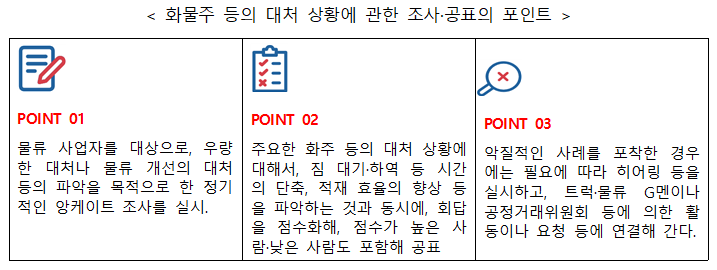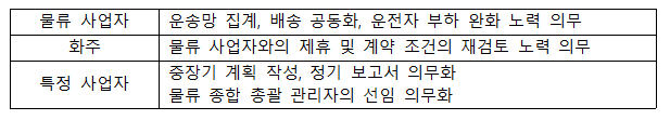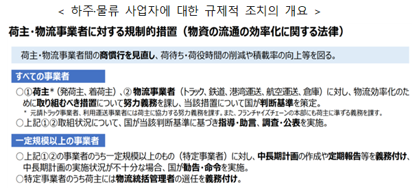 ¨è ȹ°ÀÚµ¿Â÷ ¿î¼Û »ç¾÷ÀÚ µî ¡ÞÀûÀçÀ²ÀÇ Çâ»ó (¿îÀüÀÚ 1Àδç 1ȸÀÇ ¿î¼Û¸¶´ÙÀÇ È¹°ÀÇ Áß·®ÀÇ Áõ°¡) ¡Þ ½ÇÈ¿¼ºÀÇ È®º¸ ¨é ȹ°ÀÚµ¿Â÷ °ü·Ã »ç¾÷ÀÚ (â°í, Ç׸¸¿î¼Û, Ç×°ø¿î¼Û, öµµ) ¡Þ ¿îÀüÀÚÀÇ Áü ´ë±â ½Ã°£ÀÇ ´ÜÃà(â°í¾÷ÀÚ¸¸) 2) Á¤ºÎ¿¡ ÀÇÇÑ Áöµµ¡¤Á¶¾ð, Á¶»ç¡¤°øÇ¥ Á¤ºÎ´Â ƯÁ¤ »ç¾÷ÀÚÀÇ Á¶Ä¡ÀÇ ½Ç½Ã¿¡ ´ëÇØ¼ ÇÊ¿äÇÑ Áöµµ ¹× Á¶¾ðÀ» ÇÒ ¼ö ÀÖ´Ù°í µÇ¾î ÀÖ´Ù.