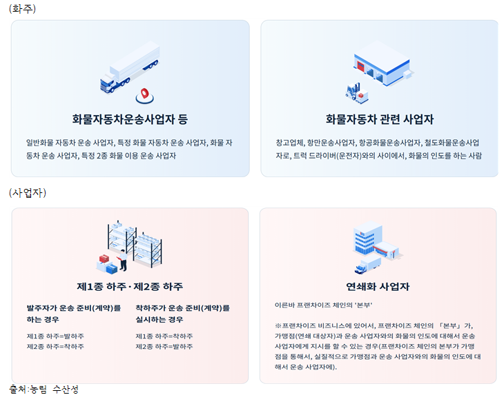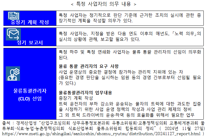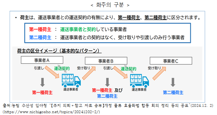 ¡¸ÇÕµ¿ ȸÀÇ Á¤¸®¡¹(2024³â 11¿ù 27ÀÏ, ±¹Åä ±³Å뼺, °æÁ¦ »ê¾÷¼º ¹× ³ó¸² ¼ö»ê¼º)¿¡¼´Â ÈÁÖ µîÀÇ ÆÇ´Ü ±âÁØ¿¡ °üÇØ¼ Á¶»ç¸¦ ½Ç½ÃÇØ ±× °á°ú¸¦ °øÇ¥ÇÏ´Â °ÍÀÌ´Ù. ÇØ´ç Á¶»ç´Â ÈÁÖÀÇ ´ëó »óȲ¿¡ ´ëÇØ¼ Áü ´ë±â¡¤ÇÏ¿ª µî ½Ã°£ÀÇ ´ÜÃà, ÀûÀç È¿À²ÀÇ Çâ»ó µî¿¡ °üÇÑ Ç׸ñº°·Î ÆÄ¾ÇÇÑ´Ù°í µÇ¾î ÀÖ´Ù. °øÇ¥ Àü¿¡ ÈÁÖ µî¿¡µµ È÷¾î¸µÀ» ÇÑ´Ù°í µÇ¾î ÀÖ´Ù. ¾ÇÁúÀûÀÎ »ç·Ê¸¦ Æ÷ÂøÇßÀ» °æ¿ì¿¡´Â Æ®·°¡¤¹°·ù G¸àÀ̳ª °øÁ¤°Å·¡À§¿øÈ¸¿¡ ÀÇÇÑ ÀÏÀ̳ª ¿ä±¸¿¡ ¿¬°áÇØ ³ª°¡°í ÀÖ´Ù£® 2. °øÆ÷·ÎºÎÅÍ 2³â À̳»¿¡ ½ÃÇàÀÇ ±ÔÁ¤(2026³â 4¿ù ÀÌÈÄ ½ÃÇà)-ÀÏÁ¤ ±Ô¸ð ÀÌ»óÀÇ »ç¾÷ÀÚ°¡ ´ë»ó ÀÏÁ¤ ±Ô¸ð ÀÌ»óÀÇ ÇÏÁÖ³ª ¹°·ù »ç¾÷ÀÚ(Æ®·°, â°í)¸¦ ƯÁ¤ »ç¾÷ÀÚ·Î Çϰí, ¹°·ù È¿À²È¸¦ À§ÇÑ ÁßÀå±â °èȹÀÇ ÀÛ¼º, ³ë·Â Àǹ«ÀÇ ½Ç½Ã »óȲÀÇ Á¤±â º¸°í µîÀÌ Àǹ«ÈµÇ¾ú´Ù. ½ÃÇàÀº 2026³âµµ 4¿ù ÀÌÈÄ·Î µÇ¾î ÀÖ´Ù. (1) ÁöÁ¤ ±âÁØ Æ¯Á¤ »ç¾÷ÀÚÀÇ ÁöÁ¤ ±âÁØÀº ¾ÕÀ¸·Î ±¹°¡°¡ Á¤·ÉÀ¸·Î Á¤ÇÒ °ÍÀ¸·Î ¾Ë·ÁÁ® ÀÖÁö¸¸, ±¹Åä±³Å뼺, °æÁ¦ »ê¾÷¼º ¹× ³ó¸² ¼ö»ê¼ºÀÇ ¡¸ÇÕµ¿ ȸÀÇ Á¤¸®¡¹(2024³â 11¿ù 27ÀÏ ¹ßÇ¥)¿¡¼´Â ÀÌÇÏÀÇ »ç°í¹æ½ÄÀÌ ³ªÅ¸³ª°í ÀÖÀ¸¹Ç·Î ¼Ò°³ÇÑ´Ù. ¨ç ƯÁ¤ ȹ°ÁÖ ÁöÁ¤ ±âÁØ Ãë±Þȹ°ÀÇ Áß·®ÀÌ 9¸¸Åæ ÀÌ»ó(°¢ ¿¬µµ) Á¦1Á¾ ÇÏÁÖ, Á¦2Á¾ ÇÏÁÖ´Â ÇÕ»êÇÏÁö ¾Ê°í, °¢°¢ÀÇ ÀÔÀå¿¡¼ »êÁ¤, ¿îÀüÀڷκÎÅÍ ¹ÞÀ» ¼ö Àִ ȹ°ÀÇ ÇÕ°è Áß·®, ƯÁ¤ ¿¬¼âÈ »ç¾÷ÀÚ(¿¬¼âÈ »ç¾÷ÀÚ: ÇÁ·£Â÷ÀÌÁî üÀÎÀÇ º»ºÎ)