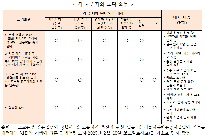 ³ë·ÂÀǹ« µî¿¡ ´ëÇÑ »ç¾÷ÀÚº°·Î ¾Ë¾Æº¸¸é ´ÙÀ½°ú °°´Ù. 1) °¢ »ç¾÷ÀÚÀÇ ³ë·Â Àǹ« »ç¾÷ÀÚº°·Î, ÀûÀçÀ²ÀÇ Çâ»ó, Áü ´ë±â ½Ã°£ÀÇ ´ÜÃà, ÇÏ¿ª µîÀÇ ´ÜÃà ¹× ±× ´ëóÀÇ ½ÇÈ¿¼ºÀ» È®º¸ÇÏ´Â Á¶Ä¡°¡ ³ë·Â Àǹ«·Î¼ ºÎ°úµÇ¾ú´Ù(¾Æ·¡ Ç¥ ÂüÁ¶). 2025³â 2¿ù 18ÀÏ¿¡ °øÆ÷µÈ ÆÇ´Ü ±âÁØÀ¸·ÎºÎÅÍ, »ç¾÷ÀÚº°·Î ³ë·Â Àǹ«ÀÇ ³»¿ëÀ» ¾Ë¾Æº»´Ù. ¨ç ȹ°ÁÖ ¡Þ ÀûÀçÀ²ÀÇ Çâ»ó (¿îÀüÀÚ 1Àδç 1ȸÀÇ ¿î¼Û¸¶´ÙÀÇ È¹°ÀÇ Áß·®ÀÇ Áõ°¡) ¡Þ ȹ° ´ë±â ½Ã°£ÀÇ ´ÜÃà