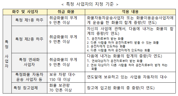 ¨è ƯÁ¤ â°í »ç¾÷ÀÚÀÇ ÁöÁ¤ ±âÁØ È¹° º¸°ü·®ÀÌ 70¸¸Åæ ÀÌ»ó(°¢ ¿¬µµ), ±âŹµÈ ÀÔ°íȹ°ÀÇ ¿¬µµÀÇ ÇÕ°è Áß·® ¨é ƯÁ¤È¹°ÀÚµ¿Â÷ ¿î¼Û »ç¾÷ÀÚ µîÀÇ ÁöÁ¤±âÁØ º¸À¯ Â÷·® ´ë¼ö°¡ 150´ë ÀÌ»ó(°¢ ¿¬µµ ¸» ½ÃÁ¡), ¿¬µµ ¸»¿¡ º¸À¯Çϰí ÀÖ´Â »ç¾÷¿ë ÀÚµ¿Â÷ÀÇ ´ë¼ö (2) Àǹ«È ³»¿ë ¹°·ùÅë°ý°ü¸®ÀÚ ¼±ÀÓÀº ƯÁ¤ ÈÁÖ¸¸, ±×¿Ü´Â ƯÁ¤ ÇÏÁÖ¡¤Æ¯Á¤ ¹°·ù»ç¾÷ÀÚ°¡ ´ë»óÀÌ´Ù.