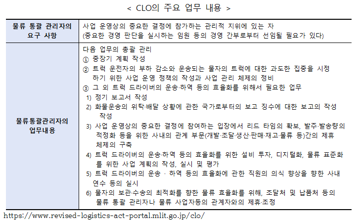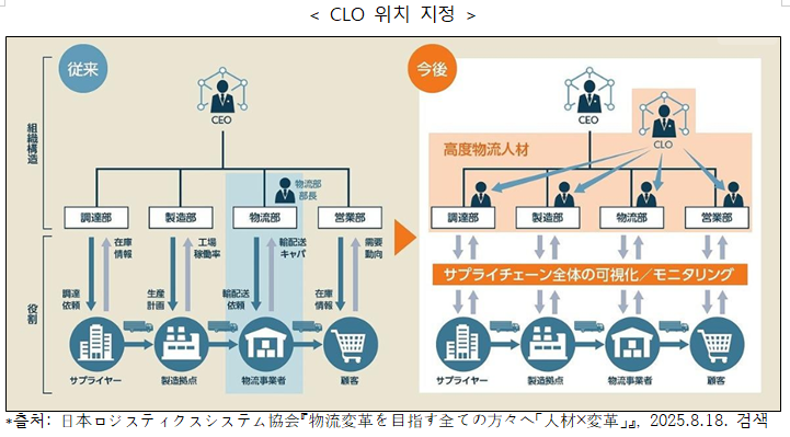 ¨ç ÁßÀå±âÀûÀÎ °èȹÀÇ ÀÛ¼º ÆÇ´Ü ±âÁØÀ» ±Ù°Å·Î ÇÑ Á¶Ä¡ÀÇ ½Ç½Ã¿¡ °üÇÑ ÁßÀå±âÀûÀÎ °èȹÀ» ÀÛ¼º. ¸Å³â Á¦ÃâÇÏ´Â °ÍÀ» ±âº»À¸·Î, °èȹ¿¡ º¯°æÀÌ ¾ø´Â °æ¿ì´Â 5³â¿¡ 1¹ø Á¦Ãâ. ¨è ³ë·ÂÀǹ«ÀÇ ½Ç½Ã »óȲÀÇ Á¤±â º¸°í ƯÁ¤ »ç¾÷Àڷμ ÁöÁ¤À» ¹ÞÀº ³¯ÀÌ ¼ÓÇÏ´Â ¿¬µµÀÇ ´ÙÀ½ ¿¬µµ ÀÌÈÄ, ¸Å³â ³ë·Â Àǹ«ÀÇ ½Ç½Ã »óȲÀ» º¸°í. »ç¾÷ÀÚÀÇ ÆÇ´Ü ±âÁØÀÇ Áؼö »óȲ, °ü·Ã »ç¾÷ÀÚ¿ÍÀÇ ´ëó »óȲ, Áü ´ë±â ½Ã°£ µî(Áü ´ë±â ½Ã°££«ÇÏ¿ª µî ½Ã°£)ÀÇ °èÃø °á°ú¸¦ º¸°í. ¨é ¹°·ùÅë°ý°ü¸®ÀÚ(CLO) ¼±ÀÓ ¹°·ùÅë°ý°ü¸®ÀÚ´Â Á¶´Þ, »ý»ê, ÆÇ¸Å µîÀÇ °¢ ºÐ¾ß¸¦ ÅëÇÕÇÏ¿© À¯Åë Àüü¸¦ È¿À²ÈÇÏ´Â »ç¾÷ ¿î¿µ»óÀÇ °áÁ¤±ÇÀ» ÁÖµµÇÏ´Â ¿ªÇÒ. ¡¼¹°·ùÅë°ý°ü¸®ÀÚÀÇ ¾÷¹« ³»¿ë¡½ 2026³â 4¿ùºÎÅÍ´Â ÀÏÁ¤ ±Ô¸ð ÀÌ»óÀÇ Æ¯Á¤ ÇÏÁÖ¿¡°Ô ¡®¹°·ùÅë°ý°ü¸®ÀÚ(CLO, Chief Logistics Offtcer)¡¯ÀÇ ¼±ÀÓÀÌ Àǹ«ÈµÈ´Ù. ±¸¹Ì¿¡¼´Â ÀÌ¹Ì CEO(ÃÖ°í°æ¿µÃ¥ÀÓÀÚ)³ª CFO(ÃÖ°íÀ繫åÀÓÀÚ)¿Í ³ª¶õÇÑ ÀÓ¿ø Ŭ·¡½º·Î Á¤ÂøÇϰí ÀÖÀ¸¸ç, ¿ù¸¶Æ®¿¡¼´Â CLO(¹°·ùÅë°ý°ü¸®ÀÚ)°¡ °æ¿µÀÇ Áß¿äÇÑ Æ÷Áö¼ÇÀ» ´ã´çÇÏ´Â µî ¸¹Àº ±â¾÷¿¡¼ CSCO(ÃÖ°í °ø±Þ¸Á Ã¥ÀÓÀÚ)°¡ °æ¿µÀÇ Çٽɿ¡ ÀÚ¸®Àâ°í ÀÖ´Â »ç·Ê°¡ ´Ã°í ÀÖ´Ù.