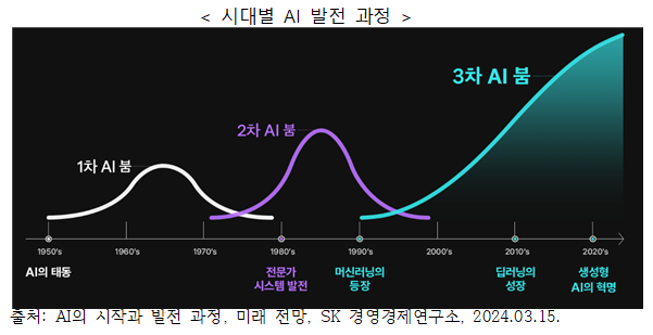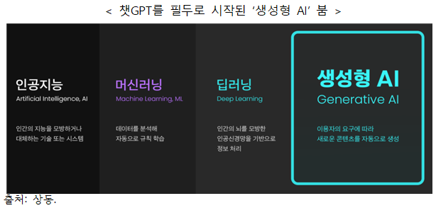 »ý¼ºÇü AIÀÇ ½ÃÀÛÀº 2014³â ÀÌ¾È ±ÂÆç·Î¿ì(Ian Goodfellow)°¡ ¹ßÇ¥ÇÑ ¡®GANs(Generative Adversarial Networks, »ý¼ºÀû Àû´ë ½Å°æ¸Á)¡¯ ¸ðµ¨ÀÌ´Ù. GANs´Â µÎ ½Å°æ¸ÁÀÌ ¼·Î °æÀïÇÏ¸é¼ ÇнÀÇÏ´Â ±¸Á¶´Ù. ÇÑ ½Å°æ¸ÁÀº ½ÇÁ¦ µ¥ÀÌÅÍ¿Í ±¸ºÐÇϱ⠾î·Á¿î »õ·Î¿î µ¥ÀÌÅ͸¦ »ý¼ºÇÏ°í ´Ù¸¥ ½Å°æ¸ÁÀº À̸¦ ½ÇÁ¦ µ¥ÀÌÅÍ¿Í ºñ±³ÇÏ¿© ÆÇº°Çϴµ¥, ÀÌ °úÁ¤À» ¹Ýº¹Çϸç Á¡Á¡ ´õ Á¤±³ÇÑ µ¥ÀÌÅ͸¦ ¿Ï¼ºÇÑ´Ù. GANs ¸ðµ¨Àº ÀÌÈÄ º¯Çü°ú °³¼±À» ÅëÇØ ÇöÀç±îÁö À̹ÌÁö »ý¼º ¹× º¯È¯ µî ´Ù¾çÇÑ ÀÀ¿ë ºÐ¾ß¿¡¼ Ȱ¹ßÇÏ°Ô »ç¿ëµÇ°í ÀÖ´Ù. 2017³â¿¡´Â ÀÚ¿¬¾î ó¸®(Natural Language Processing, NLP) ¸ðµ¨ ¡®Æ®·£½ºÆ÷¸Ó(Transformer)¡¯°¡ ¹ßÇ¥µÈ´Ù. Æ®·£½ºÆ÷¸Ó ¸ðµ¨Àº ¾ð¾î ÀÌÇØ, ±â°è ¹ø¿ª, ´ëÈÇü ½Ã½ºÅÛ µîÀÇ ÀÚ¿¬¾î ó¸® ÀÛ¾÷¿¡ Çõ½ÅÀ» °¡Á®¿Ô´Ù. ƯÈ÷ ¾Õ¼ ¾ð±ÞÇß´ø GPT µîÀÇ LLMÀÇ ÃâÇö¿¡ Å©°Ô ¿µÇâÀ» ¹ÌÃÆ´Ù. 2018³â óÀ½ Ãâ½ÃµÈ GPT´Â ¸Å³â ´õ ¸¹Àº ¸Å°³º¯¼ö¿Í ÇнÀ µ¥ÀÌÅ͸¦ »ç¿ëÇØ, ºü¸¥ ¼Óµµ·Î ¼º´ÉÀ» °³¼±ÇØ ¿Ô´Ù. ±×¸®°í 2022³â GPT-3.5¸¦ žÀçÇÑ ´ëÈÇü ÀΰøÁö´É ½Ã½ºÅÛ ÃªGPT°¡ Ãâ½ÃµÆ°í, AIÀÇ ÆÐ·¯´ÙÀÓÀ» ¿ÏÀüÈ÷ ¹Ù²ã³õ¾Ò´Ù. 2023³â ¿ÀÇ AI´Â ±â¼úÀûÀ¸·Î ÇÑ´Ü°è µµ¾àÇÑ GPT-4¸¦ Ãâ½ÃÇß´Ù. GPT-4´Â ÅØ½ºÆ®¸¦ ³Ñ¾î À̹ÌÁö¿Í ¿Àµð¿À, ºñµð¿À µî ´Ù¾çÇÑ ÀÔ·Â µ¥ÀÌÅ͸¦ µ¿½Ã¿¡ ó¸®Çϸç, µ¥ÀÌÅÍ Æ÷¸Ë ¿ª½Ã ´Ù¾çÇÏ°Ô »ý¼ºÇÏ´Â LMM(°Å´ë ¸ÖƼ¸ð´Þ ¸ðµ¨)*À¸·Î ÁøÈÇß´Ù. * LMM(Large Multimodal Model)Àº ÅØ½ºÆ®»Ó¸¸ ¾Æ´Ï¶ó À̹ÌÁö, ¿Àµð¿À, ºñµð¿À µî ´Ù¾çÇÑ ÇüÅÂÀÇ µ¥ÀÌÅÍ(Modality)¸¦ µ¿½Ã¿¡ ÀÌÇØÇÏ°í »ý¼ºÇÒ ¼ö ÀÖ´Â Â÷¼¼´ë ÀΰøÁö´É ¸ðµ¨. êGPT°¡ Ã˹ßÇÑ »ý¼ºÇü AI ºÕÀ» Ÿ°í ±â¾÷µéÀº ³Ê³ª ÇÒ °Í ¾øÀÌ ´Ù¾çÇÑ »ý¼ºÇü AI ¼ºñ½º¸¦ Ãâ½ÃÇϰí ÀÖ´Ù. ÅØ½ºÆ®, À̹ÌÁö, ¿Àµð¿À µîÀ» µ¿½Ã¿¡ ÀνÄÇϰí ÀÌÇØÇÒ ¼ö ÀÖ´Â ±¸±ÛÀÇ Á¦¹Ì³ªÀÌ(Gemini)¿Í À̹ÌÁö ³» ƯÁ¤ °´Ã¼¸¦ Á¤È®ÇÏ°Ô ÀνÄÇÏ°í ºÐ¸®ÇÒ ¼ö ÀÖ´Â ¸ÞŸÀÇ »ù(SAM), ÅØ½ºÆ® ÇÁ·ÒÇÁÆ® ±â¹ÝÀ¸·Î ¿µ»óÀ» Á¦ÀÛÇÏ´Â ¿ÀÇÂAIÀÇ ¼Ò¶ó(Sora) µîÀÌ ´ëÇ¥ÀûÀÌ´Ù. ¡¼ AI ±â¼ú ÁÖ¿ä ¹ßÀü ´Ü°è ¿ä¾à ¡½ 1. ŵ¿±â (1943~1974): ³í¸®¿Í ½Å°æ¸Á ¸ð¹æ 1950³â´ë ´ÙÆ®¸Ó½º ȸÀÇ¿¡¼ ¡®ÀΰøÁö´É¡¯ ¿ë¾î ź»ý, ±âÈ£ÁÖÀÇ Á¢±Ù¹ý(±ÔÄ¢°ú »ç½Ç ±â¹Ý)ÀÌ ½ÃÀÛ. Æ©¸µ Å×½ºÆ® Á¦¾È µî Àΰ£ Áö´É ¸ð¹æ¿¡ ´ëÇÑ ³íÀÇ ½ÃÀÛ. 2. 1Â÷ AI °Ü¿ï(1974~1980): ÇѰè Àνİú ħü Ãʱ⠿¬±¸ÀÇ ÇѰè(°è»ê ´É·Â ºÎÁ·, ¹®Á¦ ÇØ°áÀÇ ¾î·Á¿ò)·Î ¿¬±¸ ħü±â. 3. Àü¹®°¡ ½Ã½ºÅÛ ºÎ»ó(1980~1987) ƯÁ¤ ºÐ¾ß Àü¹®°¡ÀÇ Áö½ÄÀ» ¸ð¹æÇÏ´Â ¡®Àü¹®°¡ ½Ã½ºÅÛ¡¯ÀÌ µîÀåÇϸç Àá½Ã ºÎÈï. 4. 2Â÷ AI °Ü¿ï(1987~1995): Àü¹®°¡ ½Ã½ºÅÛÀÇ ¸ô¶ô Àü¹®°¡ ½Ã½ºÅÛÀÇ È®À强, À¯¿¬¼º ÇѰè·Î ´Ù½Ã ħü. 5. Á¶¿ëÇÑ ¹ßÀü°ú µö·¯´× ¼¸·(1995~2012) ±â°è ÇнÀ(Machine Learning)ÀÇ Á߿伺 ºÎ°¢, ½Å°æ¸Á ¿¬±¸ Àç°³. 1989³â ¾á ¸£ÄïÀÇ ¿ªÀüÆÄ ¾Ë°í¸®Áò Àû¿ëÀ¸·Î ¼Õ±Û¾¾ ÀÎ½Ä ¼º°ø, µö·¯´×ÀÇ ±âÃÊ ¸¶·Ã. 6. µö·¯´×ÀÇ ºÎȰ°ú Ȳ±Ý±â(2012~ÇöÀç) GPU ¼º´É Çâ»ó, ºòµ¥ÀÌÅÍ, °ø°³ SW È®»êÀ¸·Î µö·¯´×ÀÌ ±Þ¼ºÀå. À̹ÌÁö ÀνÄ, ÀÚ¿¬¾î ó¸® µî ´Ù¾çÇÑ ºÐ¾ß¿¡¼ Çõ½Å ´Þ¼º. 7. »ý¼ºÇü AI ½Ã´ë(ÇöÀç) GPT, BERT µî ´ë±Ô¸ð ¾ð¾î ¸ðµ¨ µîÀåÀ¸·Î ´ëÈ ÀÌÇØ, âÀÛ µî °íµµÈµÈ ´É·Â ½ÇÇö. »ê¾÷ Àü¹Ý¿¡ °ÉÃÄ AI Ȱ¿ëÀÌ È®»êµÇ¸ç ¹Ì·¡ ±â¼úÀÇ ÇÙ½ÉÀ¸·Î ÀÚ¸®¸Å±è. AI ±â¼úÀÇ ÀÌÇØ-¸Ó½Å·¯´×, µö·¯´×, ÀΰøÁö´É... ¾î¶»°Ô ´Ù¸¦±î?2) ¡®¾ËÆÄ°í¡¯·Î ÀÎÇØ µö·¯´×ÀÌ µîÀåÇÑ ÀÌÈÄ ´Ù¾çÇÑ ºÐ¾ß¿¡¼ ÀÌ ±â¼úÀÌ ÀÀ¿ëµÇ¸ç ÀΰøÁö´ÉÀÇ °³³äÀÌ »ç¿ëµÇ¸é¼, ¡®¸Ó½Å·¯´×¡¯, ¡®ÀΰøÁö´É¡¯, ¡®µö·¯´×¡¯°ú °°Àº ¿ë¾îµéÀÌ È¥¿ëµÇ¾î »ç¿ëµÇ°í ÀÖ´Ù. º» Àå¿¡¼´Â ÀÌ·¯ÇÑ ¿ë¾îµéÀÇ °³³ä°ú Â÷À̸¦ ¼Ò°³ÇÑ´Ù. ¸ÕÀú ÀÌ ¼¼°¡Áö ¿ë¾îÀÇ °³³äÀûÀÎ °ü°è´Â ¾Æ·¡ ±×¸²°ú °°´Ù. ÀΰøÁö´ÉÀÌ ¸ðµç ¿ë¾îµéÀ» Æ÷°ýÇÏ´Â °¡Àå Å« °³³äÀ̰í, ±× ´ÙÀ½ÀÌ ¸Ó½Å·¯´×, ÇöÀçÀÇ ÀΰøÁö´É ºÕÀ» ÁÖµµÇÏ´Â µö·¯´×ÀÌ °¡Àå ÀÛÀº °³³äÀ̶ó°í ÇÒ ¼ö ÀÖ´Ù