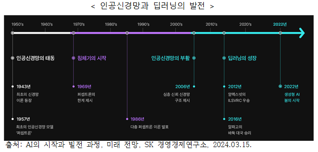 ÀÌ ½Ã±â¿¡´Â Àΰø½Å°æ¸Á(Artificial Neural Network) ¸ðµ¨¿¡ °üÇÑ ¿¬±¸µµ Ȱ¹ßÈ÷ ÁøÇàµÇ¾ú´Ù. 1957³â ÇÁ¶ûÅ© ·ÎÁ¨ºí¶ù(Frank Rosenblatt)Àº ¡®ÆÛ¼ÁÆ®·Ð(Perceptron)¡¯ ¸ðµ¨À» ÅëÇØ ÄÄÇ»ÅͰ¡ ÆÐÅÏÀ» ÀνÄÇϰí ÇнÀÇÒ ¼ö ÀÖ´Ù´Â °³³äÀ» ½ÇÁõÀûÀ¸·Î º¸¿©Áá´Ù. ÀÌ´Â 1943³â¿¡ ½Å°æ »ý¸®ÇÐÀÚ ¿ö·» ¸ÆÄ÷°(Warren McCulloch)°ú ¿ùÅÍ ÇÇÆ®(Walter Pitts)°¡ ½Å°æ¼¼Æ÷ÀÇ »óÈ£ÀÛ¿ëÀ» °£´ÜÇÑ °è»ê ¸ðµ¨·Î Á¤¸®ÇÑ ¡®½Å°æ¸Á¡¯ ÀÌ·ÐÀ» ½ÇÁ¦ Å×½ºÆ®¿¡ Ȱ¿ëÇÑ °ÍÀÌ´Ù. ÀÌ·¯ÇÑ Ãʱ⠿¬±¸ÀÇ ¼º°ú´Â ¼¼°£ÀÇ ±â´ë¸¦ ³ô¿´À¸³ª, ÄÄÇ»ÆÃ ¼º´É, ³í¸® ü°è, µ¥ÀÌÅÍ ºÎÁ· µîÀÇ ÇѰè·Î AI ¿¬±¸´Â °ð ħü±â¿¡ µé¾î¼¹´Ù. 1980³â´ë¿¡´Â »ç¶÷ÀÌ ÀÔ·ÂÇÑ ±ÔÄ¢À» ±â¹ÝÀ¸·Î ÀÚµ¿ ÆÇÁ¤À» ³»¸®´Â ¡®Àü¹®°¡ ½Ã½ºÅÛ(Expert System)¡¯ÀÌ µîÀåÇß´Ù. Àü¹®°¡ ½Ã½ºÅÛÀº ÀÇÇÐ, ¹ý·ü, À¯Åë µî ½Ç¿ëÀûÀÎ ºÐ¾ß¿¡¼ Áø´Ü, ºÐ·ù, ºÐ¼® µîÀÇ ±â´ÉÀ» ¼öÇàÇϸç ÀϽÃÀûÀ¸·Î AI¿¡ ´ëÇÑ °ü½ÉÀ» ´Ù½Ã ºÒ·¯ÀÏÀ¸Ä×´Ù. ±×·¯³ª ÀÌ ½Ã½ºÅÛÀº »ç¶÷ÀÌ ¼³Á¤ÇÑ ±ÔÄ¢¿¡¸¸ ÀÇÁ¸ÇÏ¿© µ¿ÀÛÇϸç, º¹ÀâÇÑ Çö½Ç ¼¼°è¸¦ ÀÌÇØÇÏ´Â ´É·ÂÀ» °®ÃßÁö ¸øÇß´Ù´Â ÇѰ谡 ÀÖ¾ú´Ù Àΰ£ÀÇ ¸í·ÉÀ¸·Î¸¸ ÀÛµ¿ÇÏ´ø AI´Â 1990³â´ë µé¾î¼ ½º½º·Î ±ÔÄ¢À» ã¾Æ ÇнÀÇÏ°Ô µÈ´Ù. ¹Ù·Î ¡®¸Ó½Å·¯´×(Machine Learning, ±â°èÇнÀ)¡¯ ¾Ë°í¸®ÁòÀ» Ȱ¿ëÇϸ鼺ÎÅÍ´Ù. À̰ÍÀÌ °¡´ÉÇØÁø ÀÌÀ¯´Â µðÁöÅаú ÀÎÅͳÝÀÌ µîÀåÇ߱⠶§¹®ÀÌ´Ù. ÀÌ·Î ÀÎÇØ AI°¡ ½º½º·Î ±ÔÄ¢À» ÇнÀÇÏ°í ³ª¾Æ°¡ »ç¶÷ÀÌ Ã£Áö ¸øÇÏ´Â ±ÔÄ¢±îÁö ã¾Æ³¾ ¼ö ÀÖ°Ô µÇ¾ú´Ù. AI ¿¬±¸´Â ¸Ó½Å·¯´×À» ±â¹ÝÀ¸·Î ´Ù½Ã ¼º°ú¸¦ ³»±â ½ÃÀÛÇß´Ù.