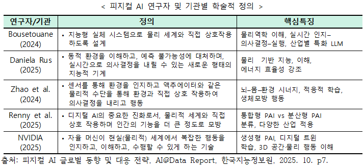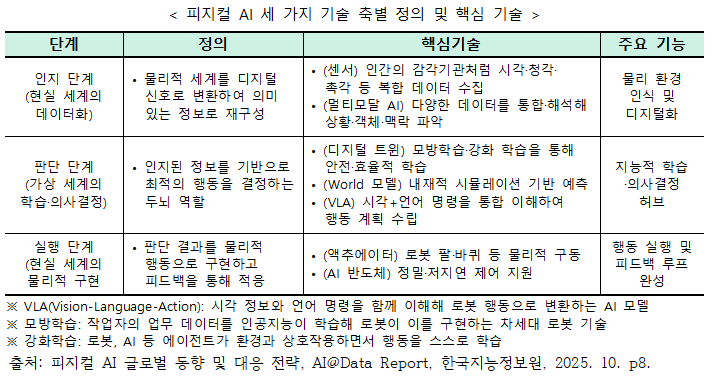 ¡¼±â¼úÀû Á¤ÀÇ¡½ ÇÇÁöÄà AI(Physical AI)ÀÇ ±â¼úÀû Á¤ÀÇ´Â ¼¾¼, ÄÄÇ»ÅÍ ºñÀü, ¿§Áö ÄÄÇ»ÆÃ µî ´Ù¾çÇÑ ±â¼úÀ» ÅëÇÕÇÏ¿© ·Îº¿, ÀÚÀ²ÁÖÇàÂ÷ °°Àº ¹°¸®Àû ½Ã½ºÅÛÀÌ Çö½Ç ¼¼°è¸¦ ½Ç½Ã°£À¸·Î ÀÎÁö(Perceive), ÀÌÇØ(Understand), ÆÇ´Ü(Reason)Çϰí, º¹ÀâÇÑ ¹°¸®Àû ÇൿÀ» ÀÚÀ²ÀûÀ¸·Î ¼öÇàÇϵµ·Ï ÇÏ´Â Áö´ÉÇü ½Ã½ºÅÛ ±â¼úÀÌ´Ù.