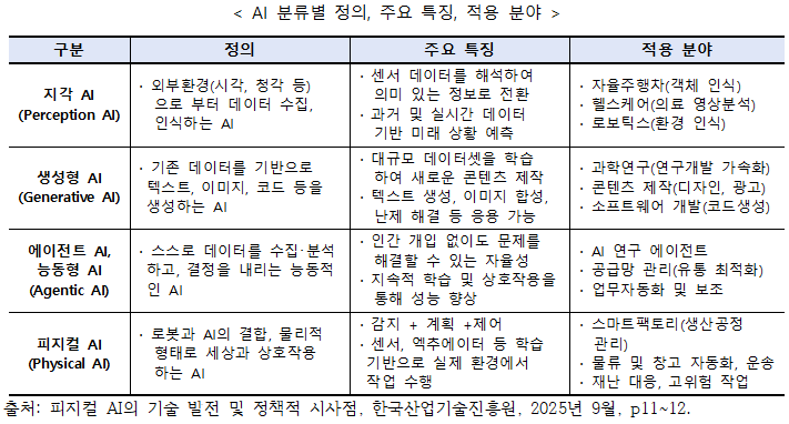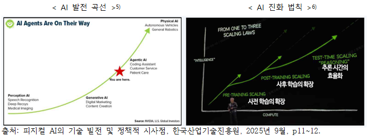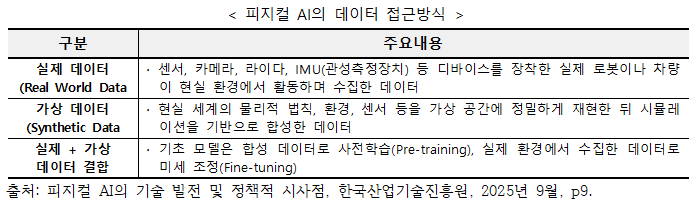 (°¡»ó µ¥ÀÌÅÍ ±â¹Ý Á¢±Ù) ¹°¸® ¹ýÄ¢À» ¹Ý¿µÇÑ µðÁöÅÐ ½Ã¹Ä·¹ÀÌ¼Ç È¯°æ¿¡¼ µ¥ÀÌÅ͸¦ ÀΰøÀûÀ¸·Î »ý¼ºÇÏ¿© Ȱ¿ëÇÏ´Â ¹æ½Ä (ÇÏÀ̺긮µå Á¢±Ù) ½ÇÁ¦ ȯ°æ¿¡¼ ¼öÁýÇÑ µ¥ÀÌÅ͸¦ ±â¹ÝÀ¸·Î ¸ðµ¨À» ±¸¼º, °¡»ó µ¥ÀÌÅ͸¦ ÅëÇØ ÇнÀ ¹üÀ§¸¦ È®ÀåÇϰųª ºÎÁ·ÇÑ »óȲÀ» º¸¿ÏÇÏ´Â ¹æ½ÄÀ¸·Î ÁøÇà ¡á ÇÇÁöÄà AI ¹ßÀü °úÁ¤ AI ±â¼úÀº ´Ü¼øÇÑ ±â´É Çâ»óÀ» ³Ñ¾î¼ Áö´ÉÀÇ ÇüÅ ÀÚü°¡ Á¡Â÷ Àΰ£ÀÇ »ç°í¿Í Çൿ¹æ½Ä¿¡ °¡±î¿öÁö´Â ¹æÇâÀ¸·Î, ¼öµ¿ÀûÀÎ µµ±¸¿¡¼ Á¡Â÷ ´Éµ¿ÀûÀÎ ÇàÀ§ÀÚ·Î ¹ßÀüÇϰí ÀÖ´Ù. (¹ßÀü°úÁ¤) ¨çÁö°¢ AI(Perception AI) ¡æ ¨è»ý¼ºÇü AI(Generative AI) ¡æ ¨é´Éµ¿Çü AI(Agentic AI) ¡æ ¨êÇÇÁöÄà AI(Physical AI)·Î ³ª´ ¼ö ÀÖ´Ù. ÃʱâÀÇ Perception AI´Â Ä«¸Þ¶ó¡¤¼¾¼ µî¿¡¼ µé¾î¿À´Â ¿ÜºÎ µ¥ÀÌÅÍ ¹× ½ÅÈ£¸¦ ¼öÁýÇϰí ÀνÄÇÏ´Â ´É·Â¿¡ ÁýÁߵǾî ÀÖÀ¸¸ç, Generative AI´Â ´ë±Ô¸ð »çÀüÇнÀÀ» ¹ÙÅÁÀ¸·Î ÅØ½ºÆ® ¹× À̹ÌÁö µîÀÇ »õ·Î¿î ÄÜÅÙÃ÷¸¦ »ý¼ºÇÏ¿© ³Á¦ ÇØ°á µî¿¡ ÀÀ¿ëµÇ°í ÀÖ´Ù.