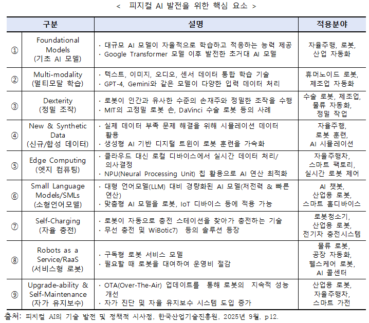 ¡á ÇÇÁöÄà AI ¹ßÀüÀ» À§ÇÑ 9°¡Áö ÇÙ½É ¿ä¼Ò ÇÇÁöÄà AIÀÇ ¹ßÀüÀ» À§Çؼ´Â Çϵå¿þ¾î¡¤¼ÒÇÁÆ®¿þ¾î¡¤µ¥ÀÌÅÍ¡¤¼ºñ½º ¸ðµ¨ Àü¹Ý¿¡¼ ±â¼úÀû¡¤¿î¿µÀû ¿ª·®À» °íµµÈÇÏ´Â ¾ÆÈ© °¡Áö ÇÙ½É ¿ä¼Ò°¡ ÇÊ¿äÇÏ´Ù. (±âÃÊ AI ¸ðµ¨, Foundational Models) ´ë±Ô¸ð µ¥ÀÌÅÍ ÇнÀÀ» ±â¹ÝÀ¸·Î ÀÚÀ² ÇнÀ°ú ÀûÀÀÀ» °¡´ÉÇÏ°Ô Çϸç, ÀÚÀ²ÁÖÇࡤ·Îº¿¡¤»ê¾÷ ÀÚµ¿È µî ´Ù¾çÇÑ ¿µ¿ªÀÇ Áö´ÉÀû ÀÇ»ç°áÁ¤ÀÇ Åä´ë°¡ µÈ´Ù. (¸ÖƼ¸ð´Þ ÇнÀ, Multi-modality) ÅØ½ºÆ®¡¤À̹ÌÁö¡¤¿Àµð¿À¡¤¼¾¼ µî ¼·Î ´Ù¸¥ ÇüÅÂÀÇ µ¥ÀÌÅ͸¦ ÅëÇÕ Ã³¸®ÇØ ÈÞ¸Ó³ëÀ̵å, ½º¸¶Æ® ¾î½Ã½ºÅÏÆ®, Á¦Á¶ ÀÚµ¿È¿Í °°Àº º¹ÇÕ È¯°æ¿¡¼ÀÇ Àνġ¤ÆÇ´Ü ´É·ÂÀ» ³ôÀδÙ. (Á¤¹Ð Á¶ÀÛ, Dexterity) ·Îº¿ÀÌ »ç¶÷ ¼öÁØÀÇ ¼ÕÀçÁÖ¿Í ¹Ì¼¼ÇÑ Á¶ÀÛÀ» ±¸ÇöÇÏ¿©, ¼ö¼ú¡¤Á¤¹Ð Á¦Á¶¡¤¹°·ù ÀÛ¾÷ µî °í³µµ ÀÛ¾÷ÀÇ ÀÚµ¿È¸¦ °¡´ÉÇÏ°Ô ÇÑ´Ù. (½Å±Ô¡¤ÇÕ¼º µ¥ÀÌÅÍ, New & Synthetic Data) ½ÇÁ¦ µ¥ÀÌÅÍ ºÎÁ·À» º¸¿ÏÇϱâ À§ÇØ ½Ã¹Ä·¹À̼ǰú »ý¼ºÇü AI ±â¹Ý µðÁöÅÐ Æ®À©À» Ȱ¿ë, ´Ù¾çÇÑ »óȲ¿¡ ´ëÇÑ ½Å¼ÓÇϰí Àúºñ¿ëÀÇ ÈÆ·ÃÀ» Áö¿øÇÑ´Ù. (¿§Áö ÄÄÇ»ÆÃ, Edge Computing) Ŭ¶ó¿ìµå ÀÇÁ¸ ¾øÀÌ ·ÎÄÿ¡¼ µ¥ÀÌÅ͸¦ ½Ç½Ã°£ 󸮡¤ÆÇ´ÜÇÏ¿©, ÀÚÀ²ÁÖÇàÂ÷³ª ½º¸¶Æ® ÆÑÅ丮 °°Àº Áö¿¬ÀÌ Ä¡¸íÀûÀΠȯ°æ¿¡¼ ¾ÈÁ¤¼º°ú ¹ÝÀÀ¼ºÀ» ³ôÀδÙ. (¼ÒÇü ¾ð¾î¸ðµ¨, Small Language Models, SMLs) ÀúÀü·Â¡¤°í¼Ó ¿¬»êÀÌ °¡´ÉÇØ ·Îº¿¡¤IoT ±â±â µî Á¦ÇÑµÈ Çϵå¿þ¾î ȯ°æ¿¡¼µµ ¸ÂÃãÇü AI ±â´ÉÀ» ±¸ÇöÇÒ ¼ö ÀÖ´Ù. (ÀÚÀ² ÃæÀü, Self-Charging) ·Îº¿ÀÌ ½º½º·Î ÃæÀü ½ºÅ×À̼ÇÀ» ã¾Æ°¡ Àü·ÂÀ» º¸ÃæÇÏ´Â ±â¼ú·Î, Àå½Ã°£¡¤¹«ÀÎ ¿î¿ëÀ» °¡´ÉÇÏ°Ô ÇÑ´Ù. (¼ºñ½ºÇü ·Îº¿, Robots as a Service, RaaS) ¸ðµ¨Àº ·Îº¿À» ±¸¸Å ´ë½Å ±¸µ¶¡¤ÀÓ´ë ¹æ½ÄÀ¸·Î Á¦°øÇÏ¿© Ãʱ⠵µÀÔ ºñ¿ë ºÎ´ãÀ» ÁÙÀ̰í È®»ê ¼Óµµ¸¦ ³ôÀδÙ.