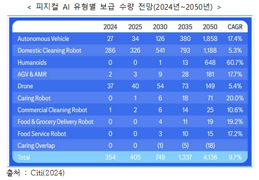 (¾÷±×·¹À̵塤ÀÚ°¡ À¯Áöº¸¼ö, Upgrade-ability & Self-Maintenance) ±â¼úÀº ¾÷µ¥ÀÌÆ®¿Í ÀÚ°¡ Áø´Ü¡¤¼ö¸® ±â´ÉÀ» ÅëÇØ ·Îº¿ ¼º´ÉÀ» Áö¼ÓÀûÀ¸·Î °³¼±ÇÏ°í ¿î¿µ È¿À²¼ºÀ» È®º¸ÇÑ´Ù. ÇÇÁöÄà AIÀÇ ±¸ºÐ7) Citi GroupÀº ÇÇÁöÄà AI °ü·Ã º¸°í¼*¿¡¼ ÇÇÁöÄà AI¸¦ ÃÑ 9°¡Áö ÇüÅ·Π±¸ºÐÇØ 2050³â±îÁö À¯Çüº° º¸±Þ ¼ö·®À» Àü¸Á(Citi, 2024)Çϰí ÀÖ´Ù. * The Rise of AI Robots : Physical AI is Coming for You