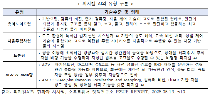 Bank of America´Â ÇÇÁöÄà AI °ü·Ã º¸°í¼¿¡¼ ÇÇÁöÄà AI¸¦ »ý¼ºÇü AI°¡ ¹°¸® ¼¼°è¿¡¼ ÀÛµ¿ÇÏ´Â ·Îº¿µé°ú °áÇյǾî Àΰ£Ã³·³ °¨Áö¡¤ÇнÀ¡¤ÆÇ´ÜÇÏ´Â ½Ã½ºÅÛÀ¸·Î Á¤ÀÇÇϰí Å©°Ô 4°¡Áö ÇüÅ ¨ç ÈÞ¸Ó³ëÀÌµå ·Îº¿, ¨è »ê¾÷¿ë ·Îº¿ ¹× Çù¾÷ ·Îº¿(Cobots), ¨é ÀÚÀ²ÁÖÇàÂ÷, ¨ê µå·ÐÀ» Á¦½ÃÇϰí ÀÖ´Ù(Bank of America, 2024). ¾Õ¼ Á¦¾ÈµÈ ÇÇÁöÄà AIÀÇ ÁÖ¿ä À¯Çü ºÐ·ù¸¦ Âü°íÇÏ¿©, ÇÇÁöÄà AI¸¦ ÈÞ¸Ó³ëÀ̵åÇü, ÀÚÀ²ÁÖÇàÂ÷Çü, µå·ÐÇü, AGV & AMRÇü 4°¡Áö·Î ±¸ºÐÇÏ¿© º¸¸é <Ç¥-ÇÇÁöÄà AIÀÇ À¯Çü ±¸ºÐ>°ú °°´Ù.