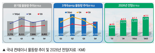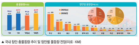 Ç׸¸º°·Î º¸¸é ºÎ»êÇ×Àº ȯÀû ¹°µ¿·®À» Áß½ÉÀ¸·Î ¾ÈÁ¤ÀûÀÎ Áõ°¡¼¼¸¦ À̾¸ç, ±¹³» ÃÖ´ë ÄÁÅ×ÀÌ³Ê Çãºê Ç׸¸ÀÇ À§»óÀ» °ø°íÈ÷ ÇÒ Àü¸ÁÀÌ´Ù. 2026³â ºÎ»êÇ× ÄÁÅ×ÀÌ³Ê ¹°µ¿·®Àº ¾à 2,480¸¸ TEU¿¡ À̸¦ °ÍÀ¸·Î ¿¹»óµÇ¸ç, Àüü ¹°·® °¡¿îµ¥ ȯÀû ȹ°ÀÌ Â÷ÁöÇÏ´Â ºñÁß ¿ª½Ã ¿©ÀüÈ÷ ¾ÐµµÀûÀÎ ¼öÁØÀ» À¯ÁöÇÒ °ÍÀ¸·Î ºÐ¼®µÆ´Ù. ÀÎõÇ×Àº ´ë¿Ü ºÒÈ®½Ç¼º ¿ÏÈ¿Í Àü·« ȹ° Áß½ÉÀÇ ¸¶ÄÉÆÃ °È¿¡ ÈûÀÔ¾î Àü³â´ëºñ 3% ÀÌ»ó Áõ°¡ÇÑ 357¸¸TEU¸¦ ó¸®ÇÏ¸ç ¿ª´ë ÃÖ´ë ½ÇÀûÀ» °æ½ÅÇÒ °ÍÀ¸·Î ³»´ÙºÃ´Ù. ±¤¾çÇ×µµ ÄÁÅ×ÀÌ³Ê ºÎµÎ »ý»ê¼º Á¦°í¸¦ ¹ÙÅÁÀ¸·Î 200¸¸TEU ÀÌ»óÀÇ ¹°µ¿·®À» ¾ÈÁ¤ÀûÀ¸·Î È®º¸Çϸç Á¡ÁøÀûÀΠȸº¹¼¼¸¦ º¸ÀÏ °ÍÀ¸·Î °üÃøµÆ´Ù.