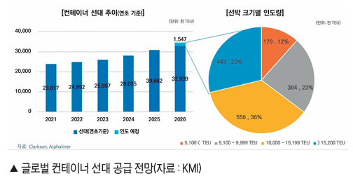 °ø±Þ Ãø ±¸Á¶¸¦ º¸¸é, 2026³â ±Û·Î¹ú ÄÁÅ×ÀÌ³Ê ¼±´ë Áõ°¡À²Àº 4~5% ¼öÁØÀ¸·Î ¿¹»óµÈ´Ù. ÀÌ´Â 2024³â 11%, 2025³â ¾à 7%¿¡ ºñÇØ¼´Â µÐÈµÈ ¼öÄ¡Áö¸¸, ¼ö¿ä Áõ°¡À²À» ¿©ÀüÈ÷ »óȸÇÏ´Â ¼öÁØÀÌ´Ù. ¹ßÁÖ ÀÜ·®ÀÌ Àüü ¼±´ëÀÇ ¾à 33%¿¡ ´ÞÇϸé¼, ÁßÀå±âÀûÀ¸·Î °ø±Þ ¾Ð·ÂÀÌ ¿ÏÀüÈ÷ ÇØ¼ÒµÇ±â±îÁö´Â ½Ã°£ÀÌ ÇÊ¿äÇÒ °ÍÀ¸·Î ºÐ¼®µÈ´Ù. ƯÈ÷ 2026³â¿¡µµ 1¸¸TEU ÀÌ»ó ´ëÇü ÄÁÅ×À̳ʼ± Àεµ°¡ Áö¼ÓµÉ °ÍÀ¸·Î ¿¹»óµÇ¸é¼, ÃÊ´ëÇü ¼±¹Ú Áß½ÉÀÇ °ø±Þ ±¸Á¶°¡ ´õ¿í °ÈµÉ °ÍÀ¸·Î º¸ÀδÙ. ¼±º¹ ±Ô¸ðº°·Î´Â 1¸¸~1¸¸ 5,000TEU±Þ°ú 1¸¸ 5,000TEU ÀÌ»ó ¼±¹ÚÀÌ ½Å±Ô ÀεµÀÇ »ó´ç ºÎºÐÀ» Â÷ÁöÇϸç, Áß´ëÇü±Þ ¼±´ë ºñÁß È®´ë°¡ À̾îÁú °ÍÀ¸·Î ³ªÅ¸³µ´Ù. ºÏ±ØÇ×·Î ´ëü Ç×·Î ³Ñ¾î Àü·« ÀÚ»êÀ¸·Î ºÎ»ó